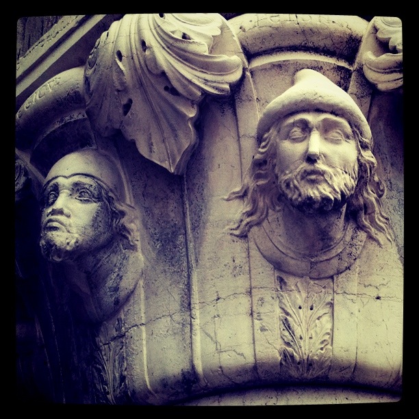 We found some really bad pizza at a walk up restaurant before moving along to the Rialto Bridge. It was super crowded, but we got a couple of unique photos while at the top. Being tourists in Venice, we were required to hit all of the major Venice tour stops, so next up was St. Mark’s square. The Basilica in the square had a line that wrapped around the front of the building – too long to wait. Instead, we took the time to look at the interesting sculptures that encircled the columns of the building leading to the open water.